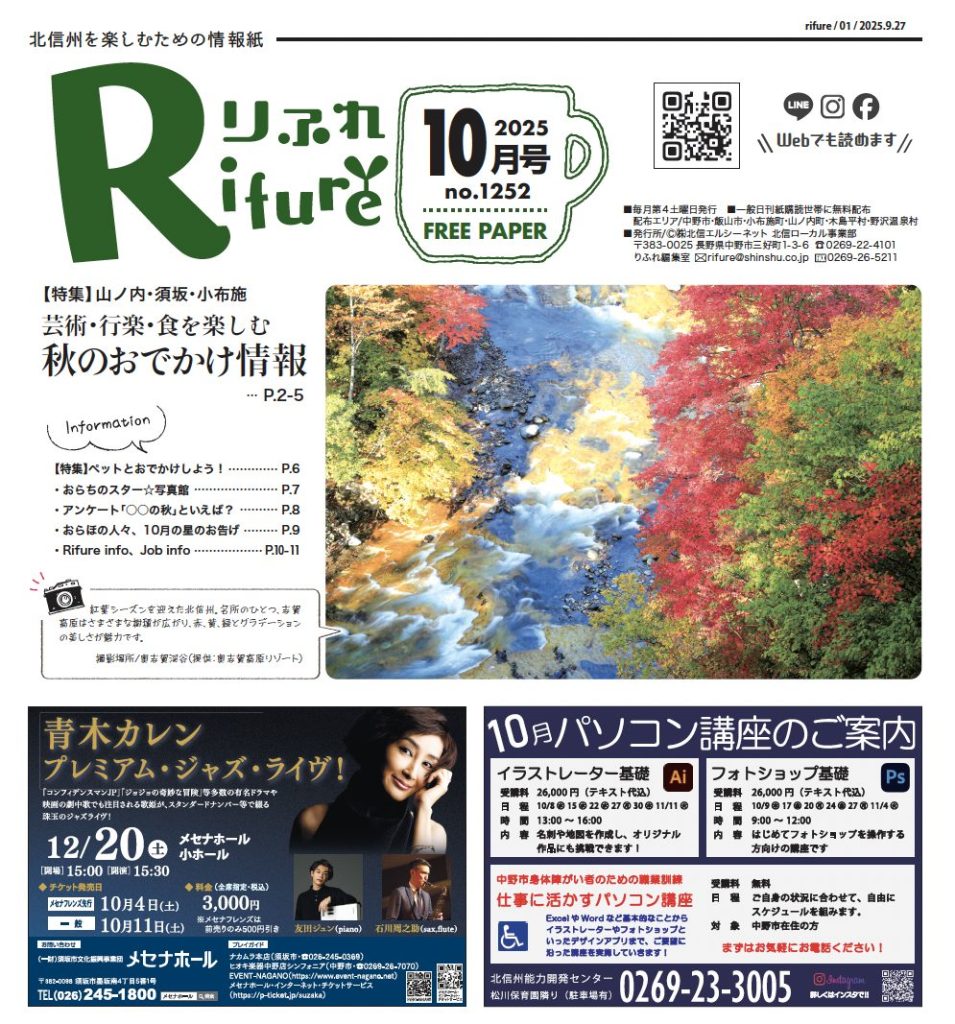 北信州を楽しむための情報紙「りふれ」は第4土曜日に日刊紙といっしょにフリーペーパーとしてお届けしています。お近くのスーパー、コンビニエンスストアなどにも配置しています。 -