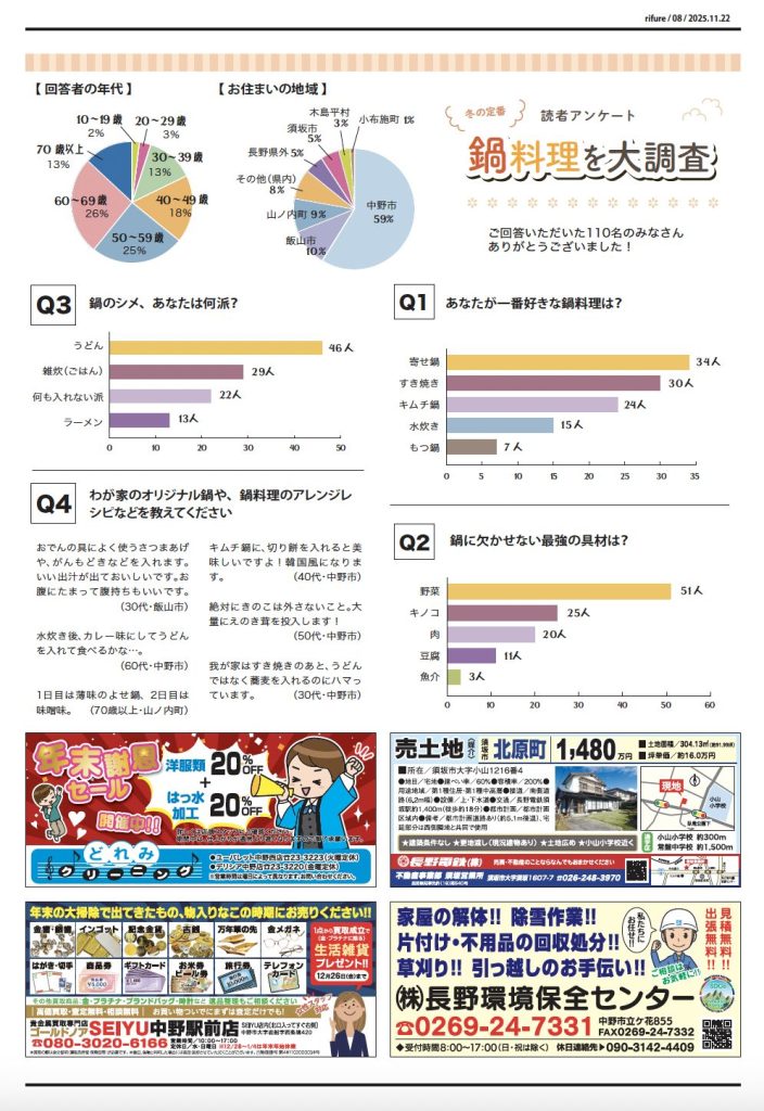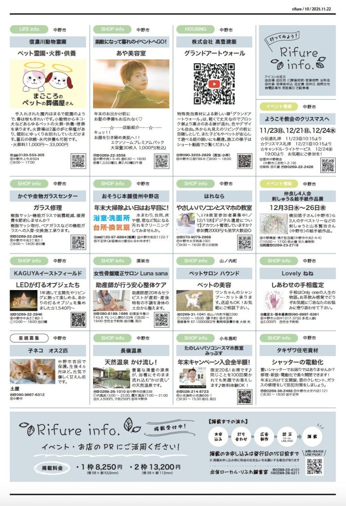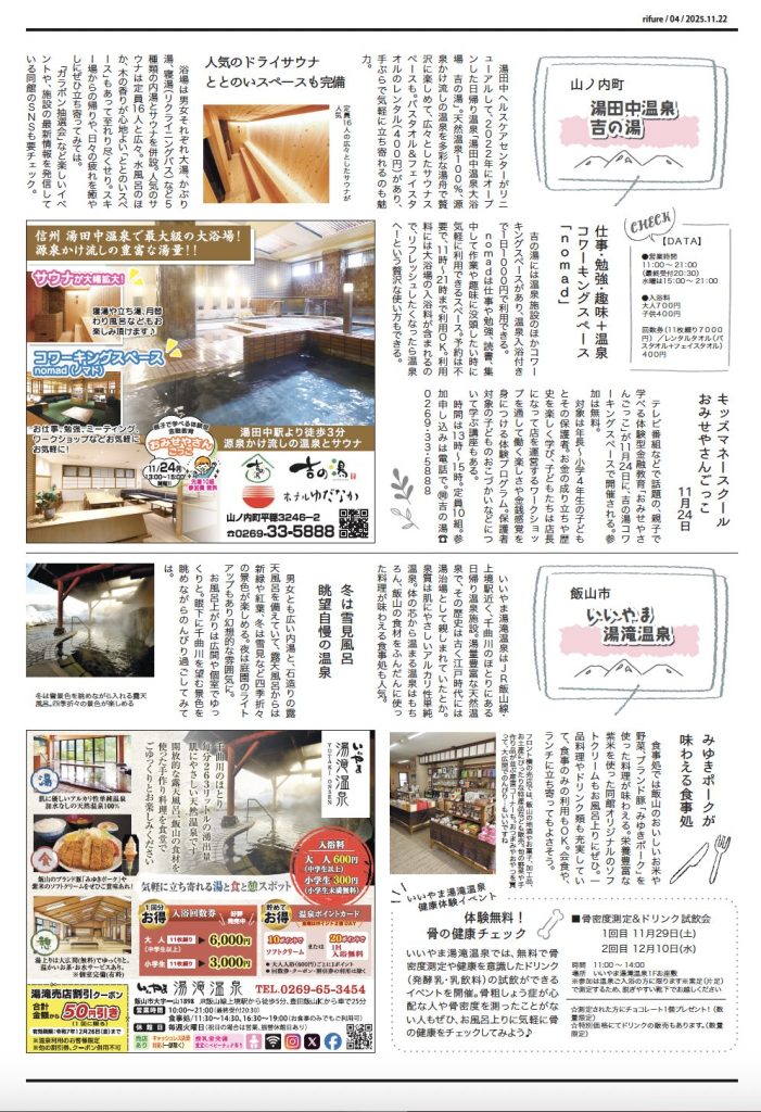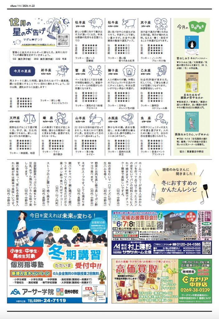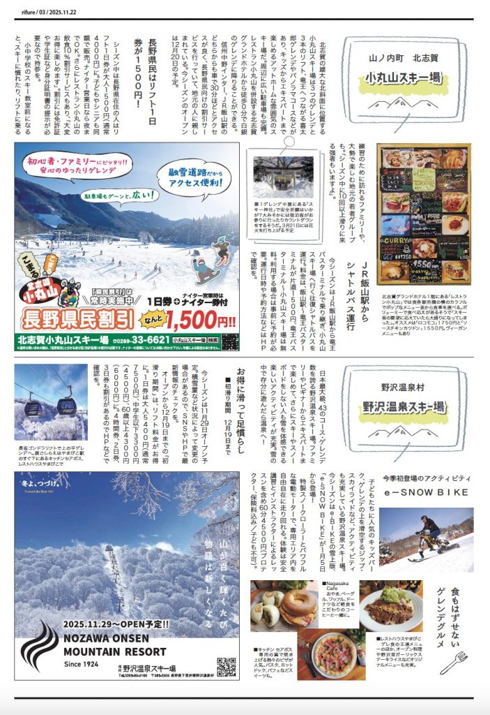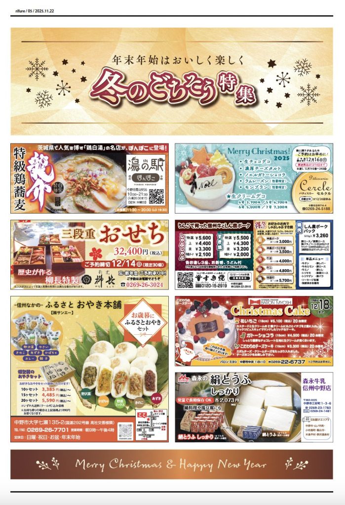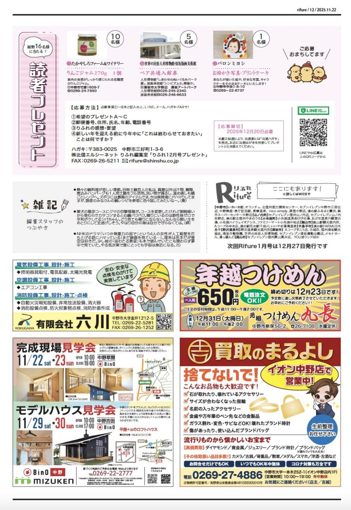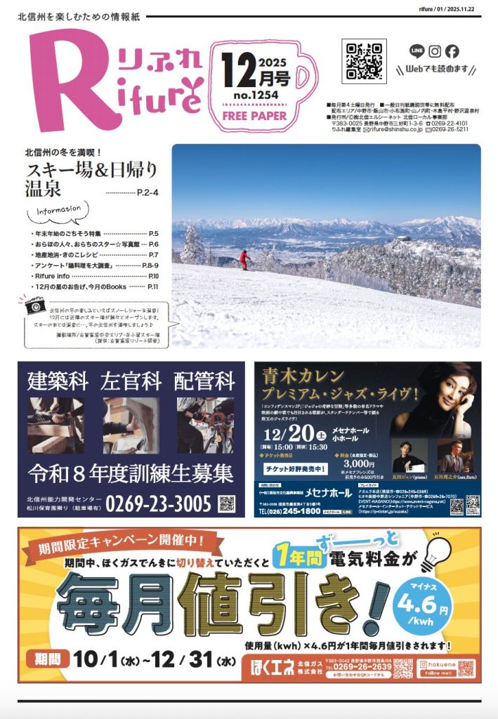 りふれ12月号 本日発行 2025 11/23 りふれ最新号 2025-11-23 北信州を楽しむための情報紙「りふれ」は第4土曜日に日刊紙といっしょにフリーペーパーとしてお届けしています。お近くのスーパー、コンビニエンスストアなどにも配置しています。 りふれ最新号 URLをコピーしました! りふれ11月号 本日発行 この記事を書いた人 rifurelocal 関連記事 りふれ11月号 本日発行 2025-10-26 りふれ10月号 本日発行 2025-09-27 りふれ9月号 本日発行 2025-08-24 8月号 本日発行 2025-07-27 7月号 本日発行 2025-06-28 6月号 本日発行 2025-05-25 5月号 本日発行 2025-04-27 4月号 本日発行! 2025-03-23 コメント コメントする コメントをキャンセルコメント ※ 名前 ※ メール ※ サイト 次回のコメントで使用するためブラウザーに自分の名前、メールアドレス、サイトを保存する。